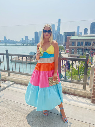 I saw this dress on the Shopbop website and knew I had to have it. I think it's perfect for a fun summer day and love the bright colors. I paired the dress with strappy heeled sandals to match the blue hem of the dress, white pearl and diamond cluster earrings, and a gold embellished clutch to add some sparkle.