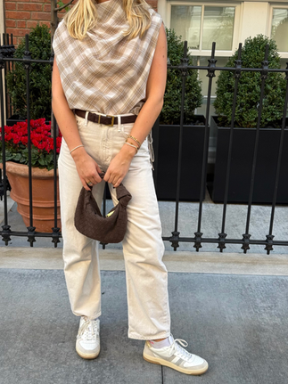 On Saturday I had lunch plans and decided to stick with a Fall color palette. I wore this amazing top from Kallmeyer, beige barrel jeans from Citizen of Humanity, and paired it with brown suede accessories.